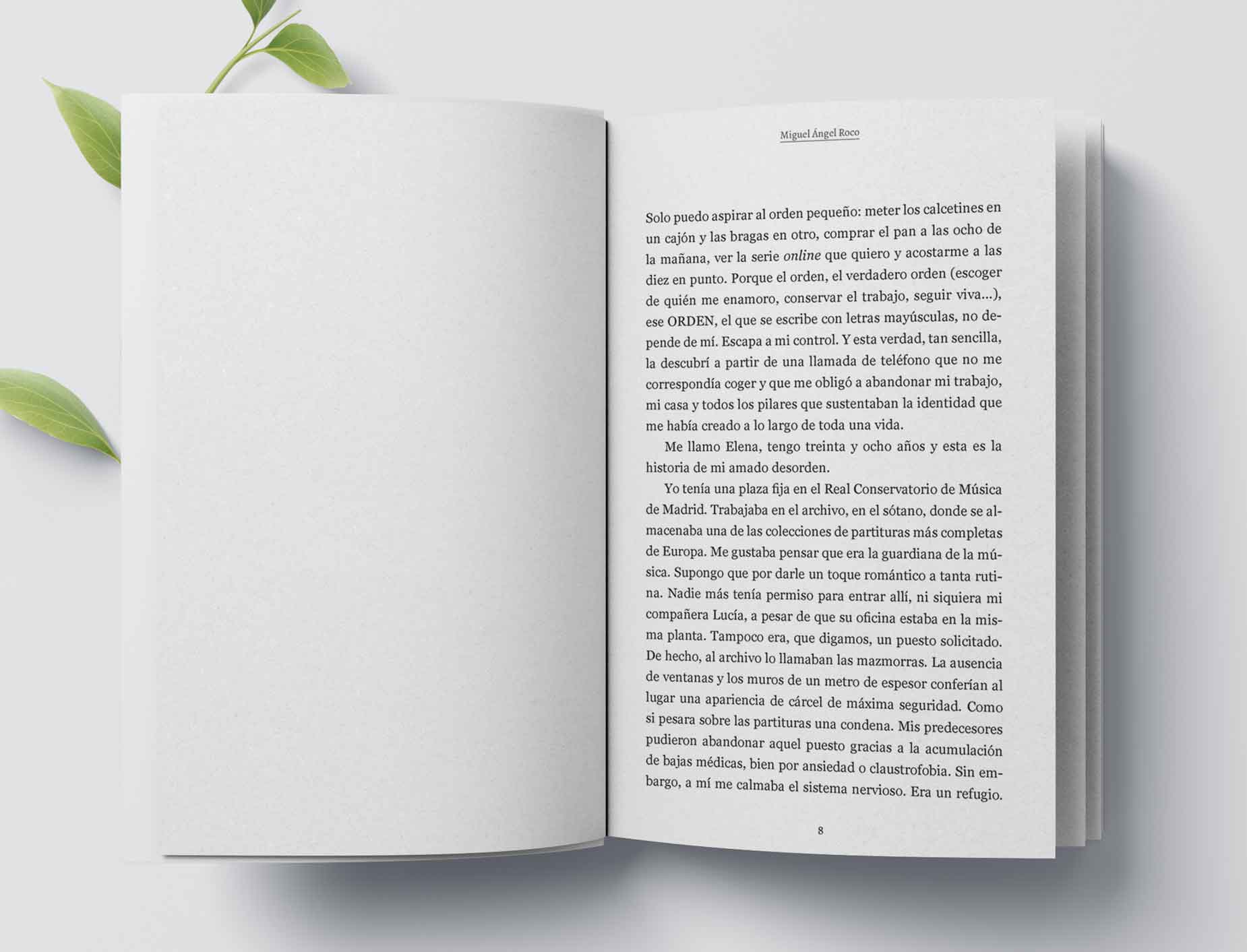 «Solo puedo aspirar al orden pequeño: meter los calcetines en un cajón y las bragas en otro, comprar el pan a las ocho de la mañana, ver la serie que quiero y acostarme a las diez en punto. Porque el orden, el verdadero orden (escoger de quién me enamoro, conservar el trabajo, seguir viva…), ese ORDEN, el que se escribe con letras mayúsculas, no depende de mí. Escapa a mi control. Y esta verdad, tan sencilla, la descubrí a partir de una llamada de teléfono que no me correspondía coger y que me obligó a abandonar mi trabajo, mi casa y todos los pilares que sustentaban la identidad que me había creado a lo largo de toda una vida.»